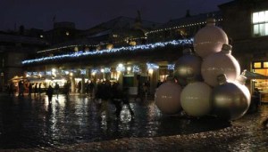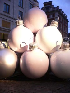 Covent Garden – dieser Platz hat es mir schon immer angetan. Haben wir doch in der Schule darüber gehört und die Handlung des Musicals My Fair Lady beginnt dort. Beim Rundgang fielen mir diese Christbaumkugeln auf. Auf dem nächsten Bild sind rechts Stühle zu sehen, so bekommt man eine Vorstellung, wie groß sie waren.