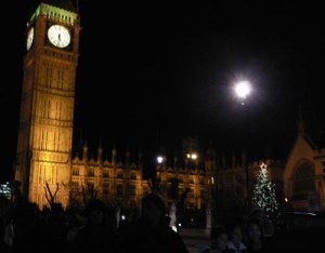 Kurz vor der Abfahrt Richtung Flughafen, konnte noch der beleuchtete Big Ben fotografiert werden. Ein riesiger Tannenbaum steht rechts vor dem House of Parlament.