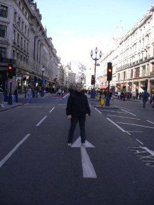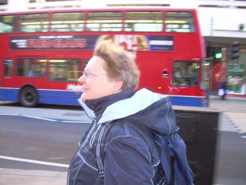 Kathi auf der autofreien Regent Street, toll, was die Weltstadt sich alles einfallen läßt. Von dem Verkehrschaos rings herum auf den Ausweichstraßen bekommt keiner etwas mit.