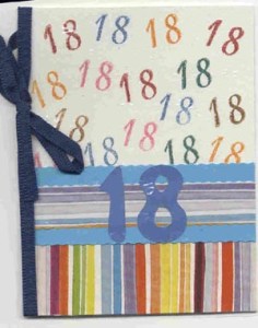 Zum 18. Geburtstag brauchte ich eine Karte. Mit meinen verschiedenen DistressStempelkissen habe ich die 18en gestempelt. Mit Hilfe einer Schablone von Fiskars wurde die große 18 ausgeschnitten. Die Streifen habe ich aus einem Stück Geschenkpapier ausgeschnitten, eine Bastlerin kann ja alles verwenden. Leider nicht so gut zu erkennen ist die geprägte Folie. Die Folie habe ich mit der Cuttlebugschablone \“Happy Birthday\“ geprägt.