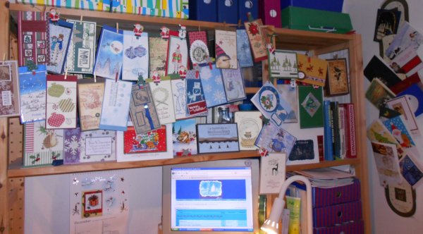 Mit diesem Bild, was meinen derzeitigen PC/Bastelplatz zeigt, möchte ich mich für dieses Jahr verabschieden und auch gleichzeitig Danke sagen, für die wunderschönen TAGs und Karten, die diesen Platz erheblich verschönern.