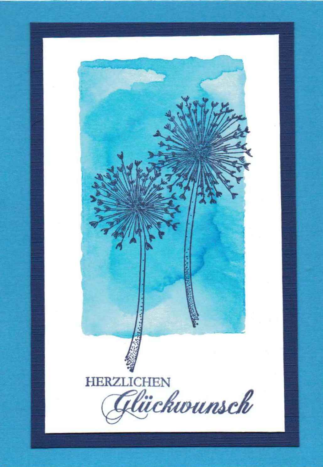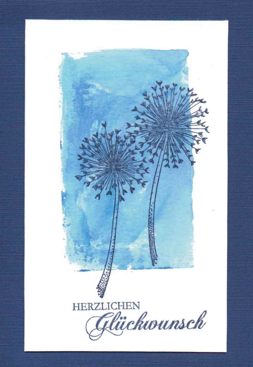 Im Moment brauche ich für mein Hobby Lesen sehr viel Zeit, aber zwischendurch schaffe ich es dann doch noch, ein paar Karten zu machen. Hier hat es mir eindeutig der Stempel mit den Pusteblumen angetan. Mal wieder, kann ich sagen, denn es sind nicht die ersten Karten mit dem Motiv und werden mit Sicherheit auch nicht die letzten sein