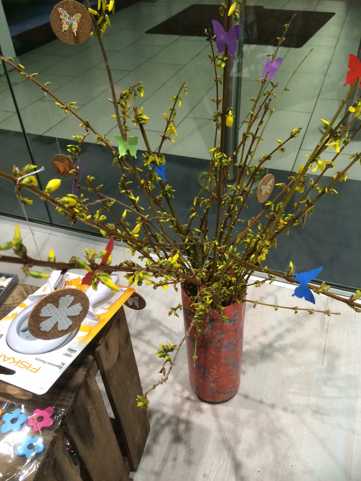 Meine Kollegin Sonja und ich durften uns jetzt auch ein bisschen austoben und nach der Osterdeko für die Frühlingsdeko sorgen. Es hat uns sehr viel Spaß gemacht und ich finde unsere Deko wirklich sehr gelungen, achja und Inge hat uns Zweige zur Verfügung gestellt