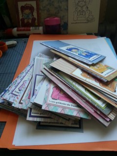 Danach wird geeignetes Motivpapier aus meinen Vorräten heraus gesucht. Auf dem Bild ist der Stapel mit den Stempelabdrücken und dem Motivpapier zu sehen.