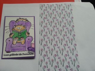 Zunächst wird Papier zurecht gelegt und bestempelt. Einer meiner Lieblingsstempel von Penny Black – lesende Katze und der Spruchstempel kamen mehrfach zum Einsatz.