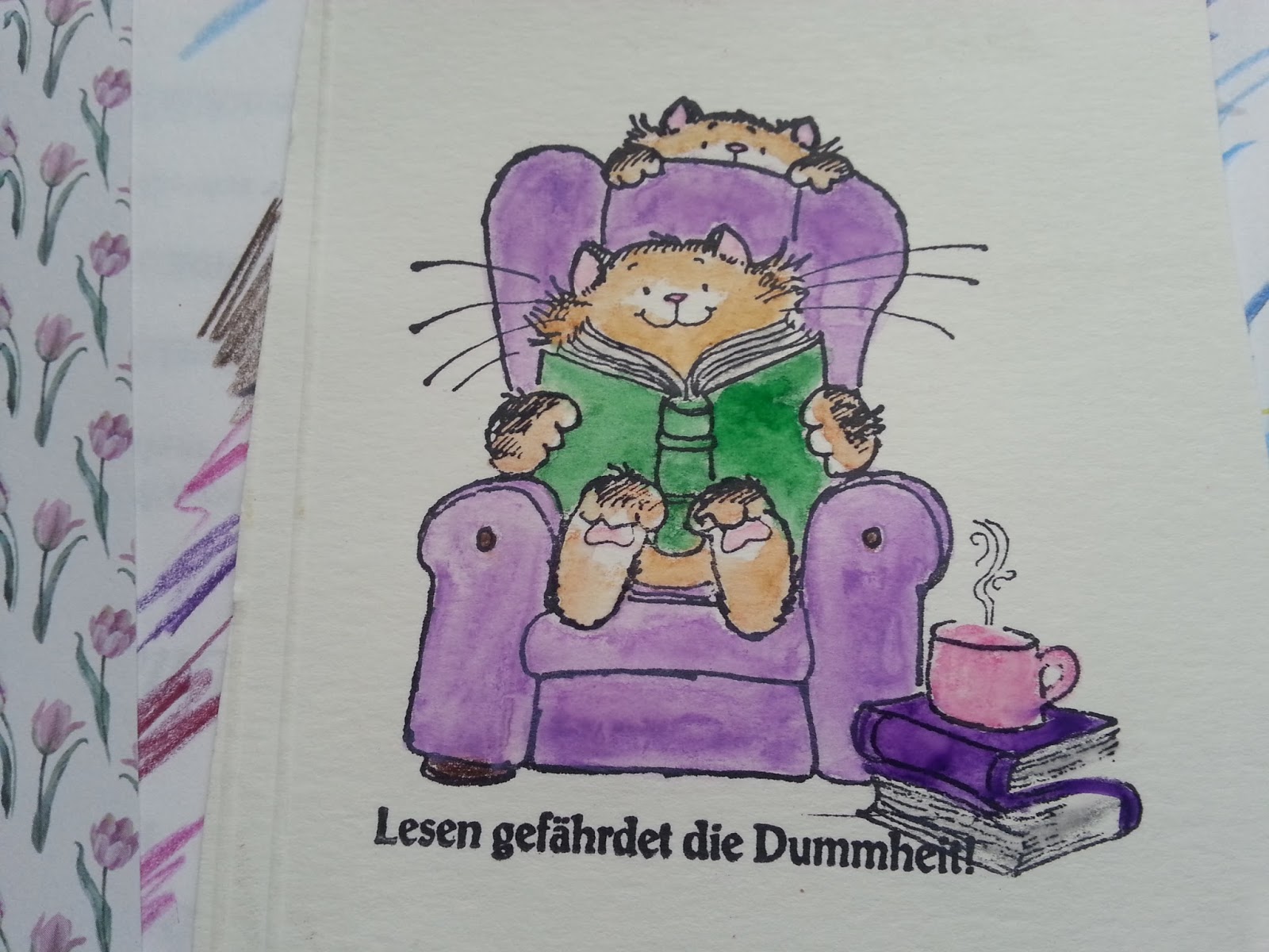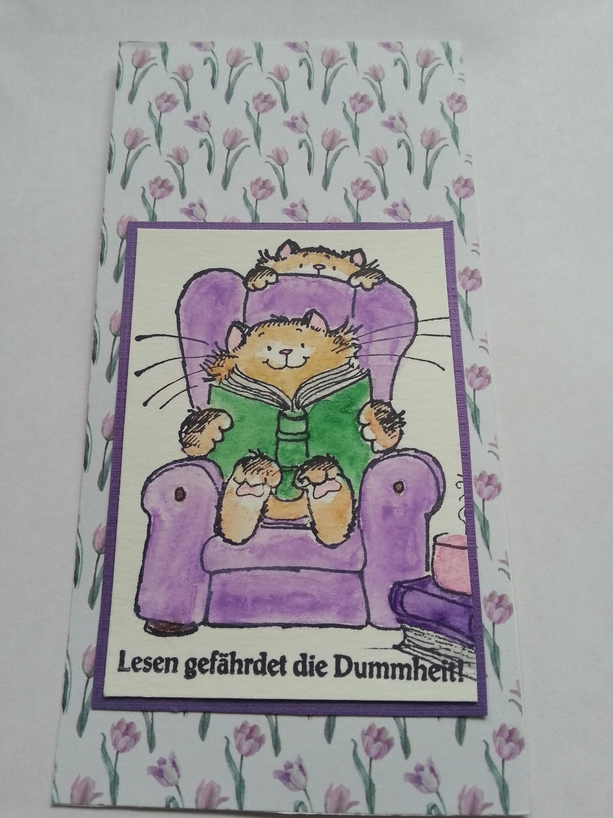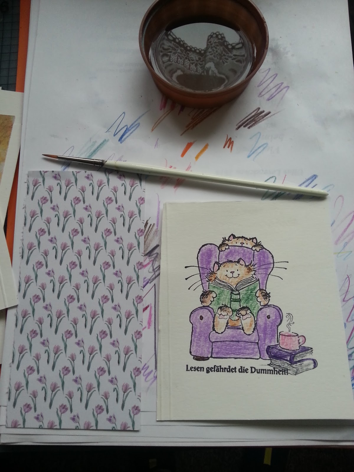 Zunächst wird Papier zurecht gelegt und bestempelt. Einer meiner Lieblingsstempel von Penny Black – lesende Katze und der Spruchstempel kamen mehrfach zum Einsatz.
