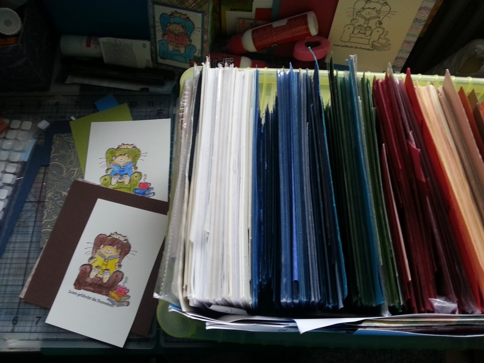 Schritt für Schritt arbeite ich mich vor. Hier sind nun alle Stempelabdrücken coloriert und als nächstes brauche ich farblich passendes Papier, um das Stempelbildchen zu matten. So heißt es, wenn das Stempelbild nicht direkt auf das Motivpapier geklebt wird, sondern so zu sagen noch eine Farbe dazwischen kommt.
