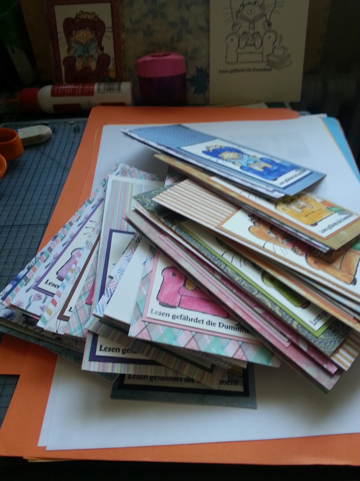 Ein Lesezeichen basteln? Ach was, das wäre ja zu einfach. Wenn schon, denn schon, dachte ich und wollte so um die 20 Stück anfertigen. Naja, auf einmal war ich so im Stempel-Colorierrausch, dass es am Ende 41 Stück waren. Danach hatte ich aber keine Lust mehr, denn ich hätte ja auf 50 aufstocken können, aber irgendwann ist die Luft auch mal raus.