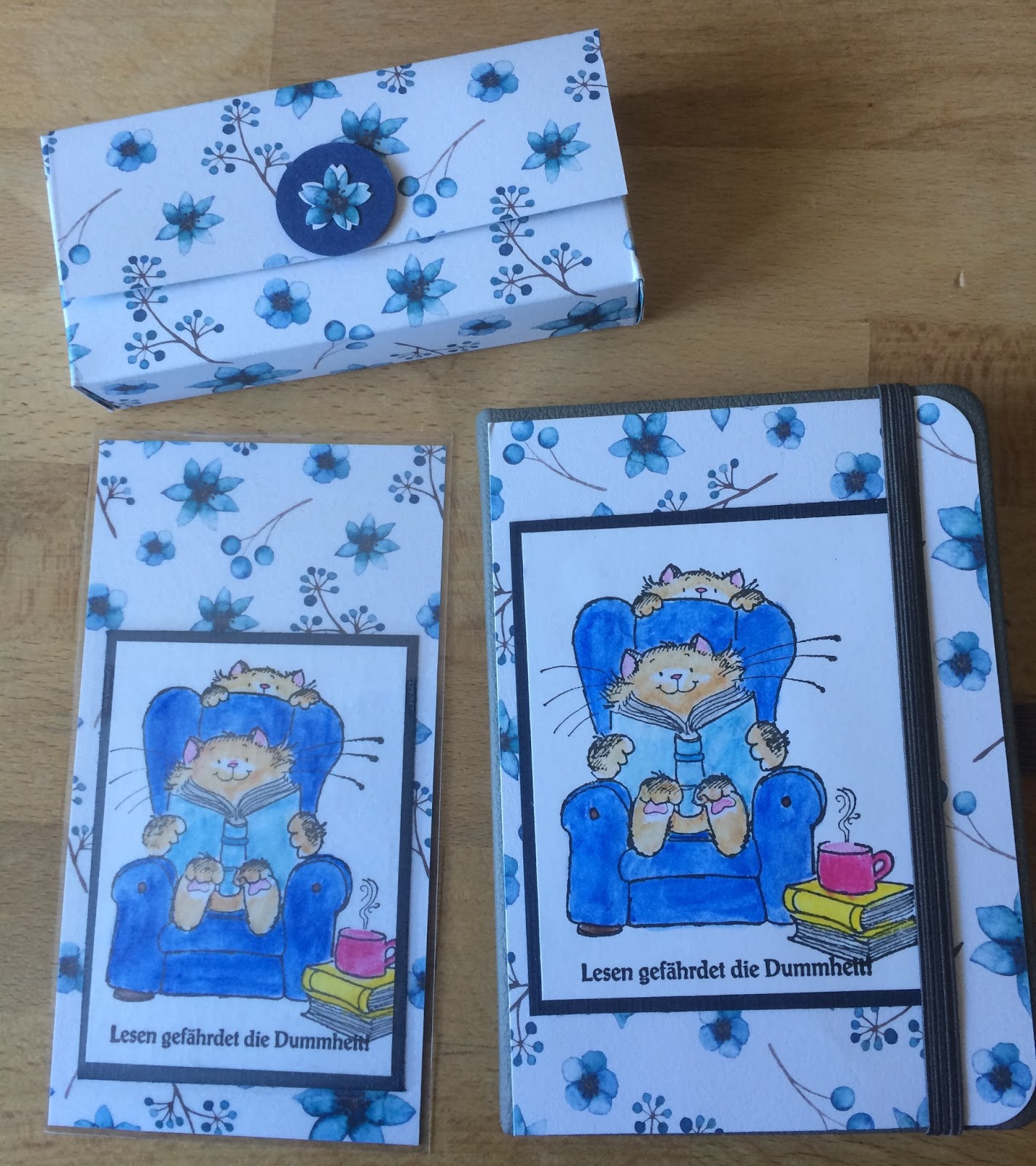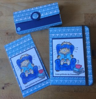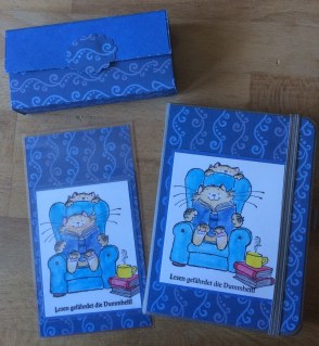 ein Lesezeichen, ein kleines Notizbüchlein und eine TaTüBox