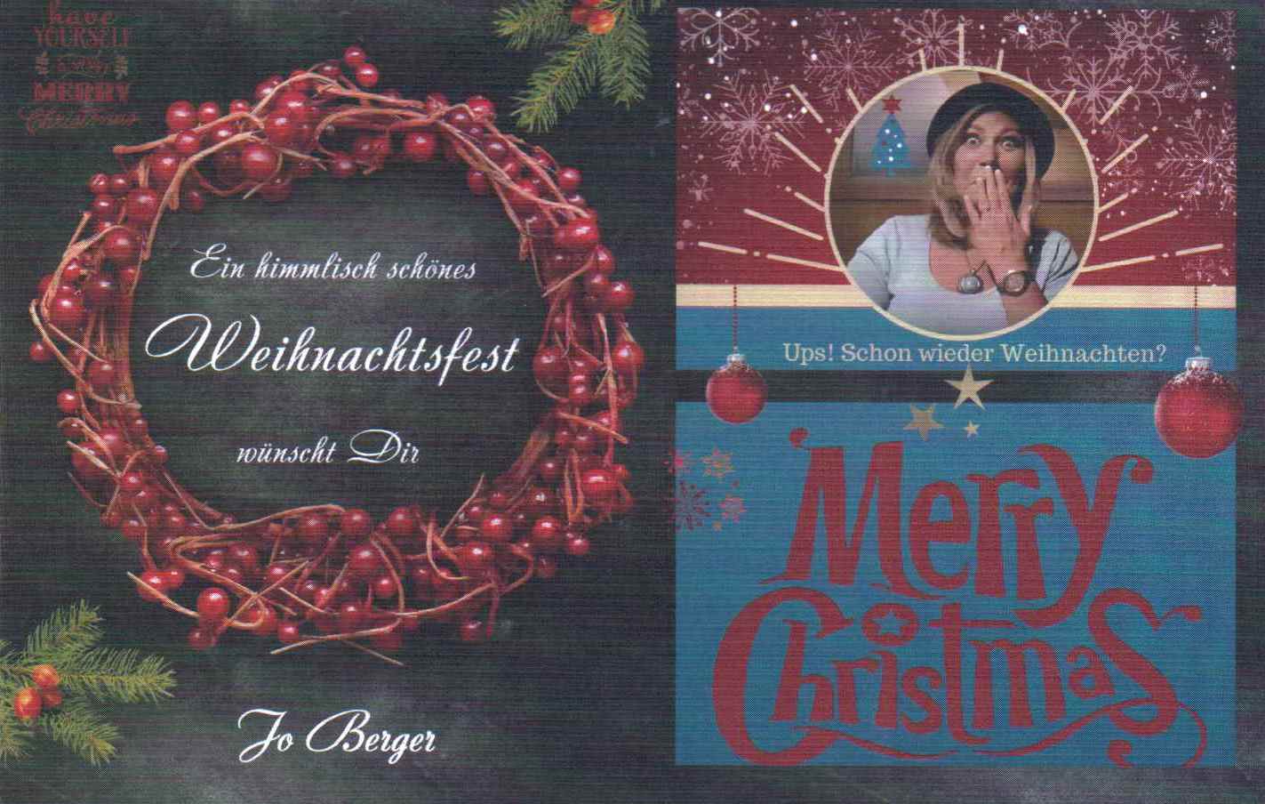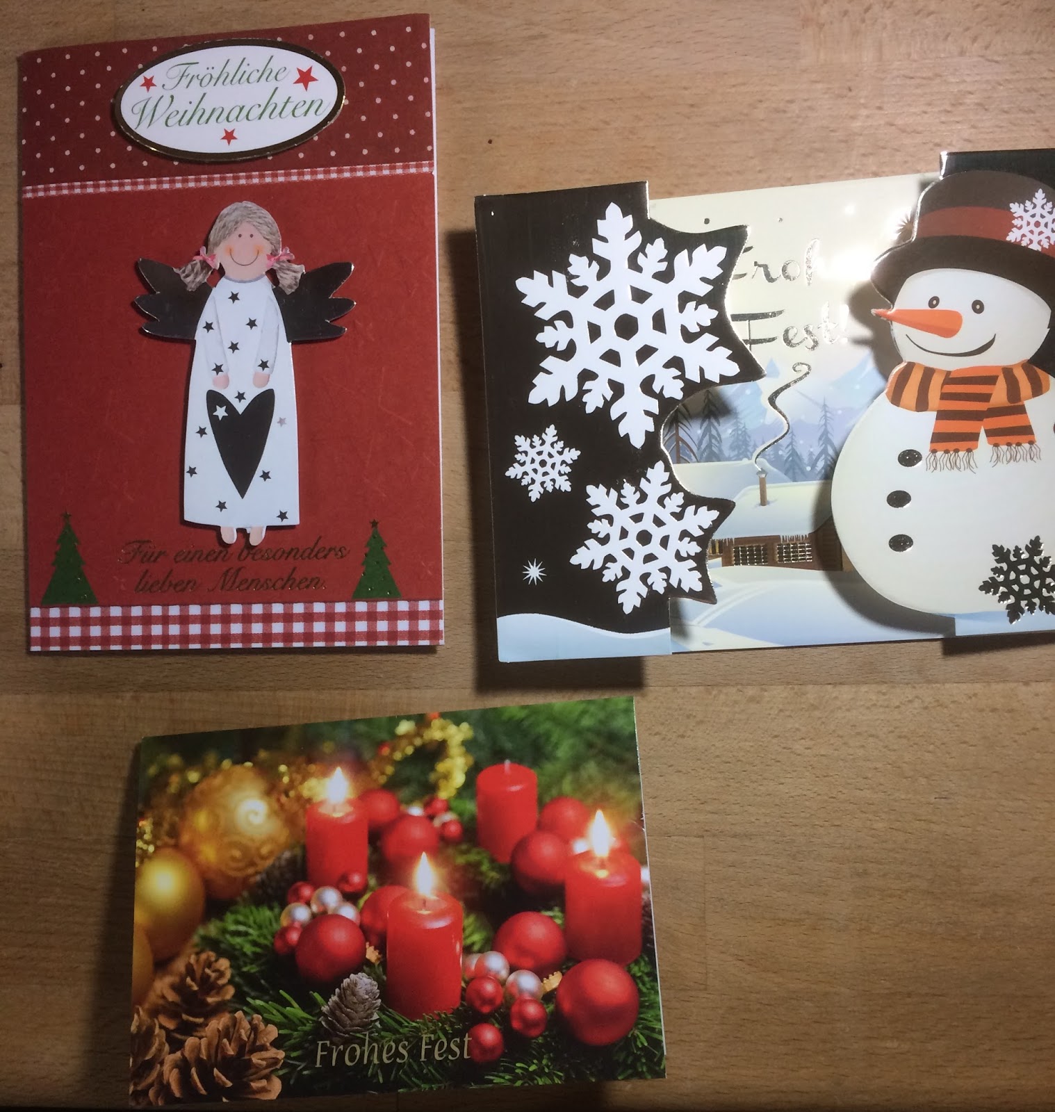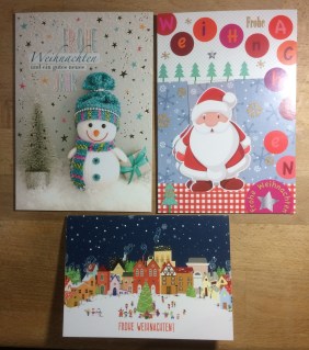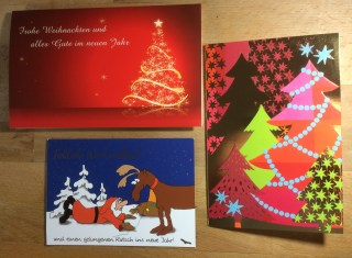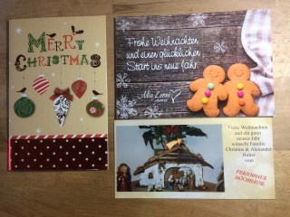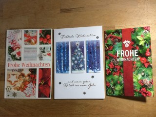 In den vergangenen Jahren war es so, dass ich meist selbst gestaltete Weihnachtskarten erhalten und natürlich habe ich die gerne gezeigt, denn es waren supertolle Karten darunter. In diesem Jahr habe ich aber auch sehr viele Karten bekommen, die nicht selbst gemacht aber selbst ausgesucht worden sind und die haben mich ebenfalls erfreut. Deshalb zeige ich in diesem Jahr alle erhaltenen Karten und bedanke mich noch einmal recht herzlich bei allen Absendern, Ihr habt mir eine große Freude bereitet und meiner Briefträgerin ebenfalls, ehrlich!