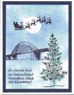 hier wurden mehrere Stempel miteinander kombiniert. Wichtig war für mich, dass ich die Fehmarnsundbrücke für meine Winterkarten einsetzen konnte. Bisher habe ich immer nur Sommerkarten mit diesem Stempel gestaltet