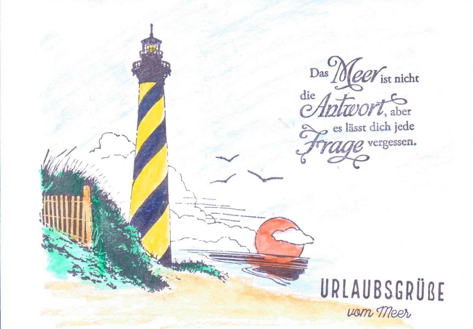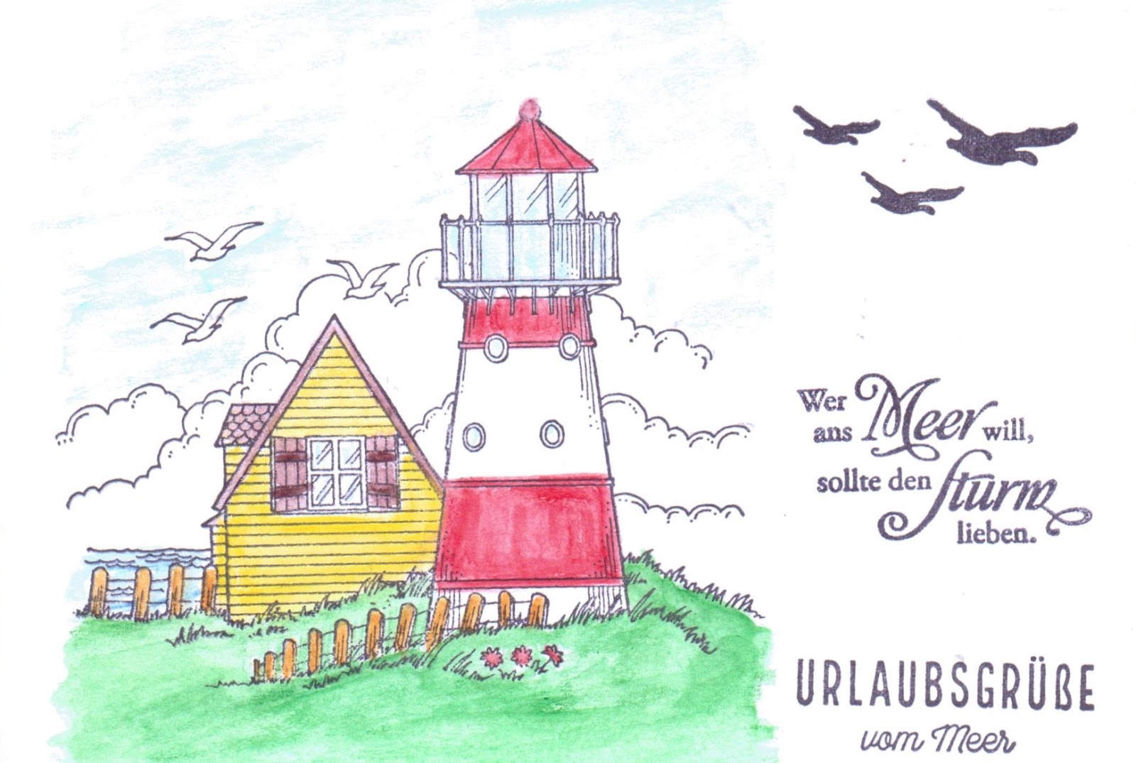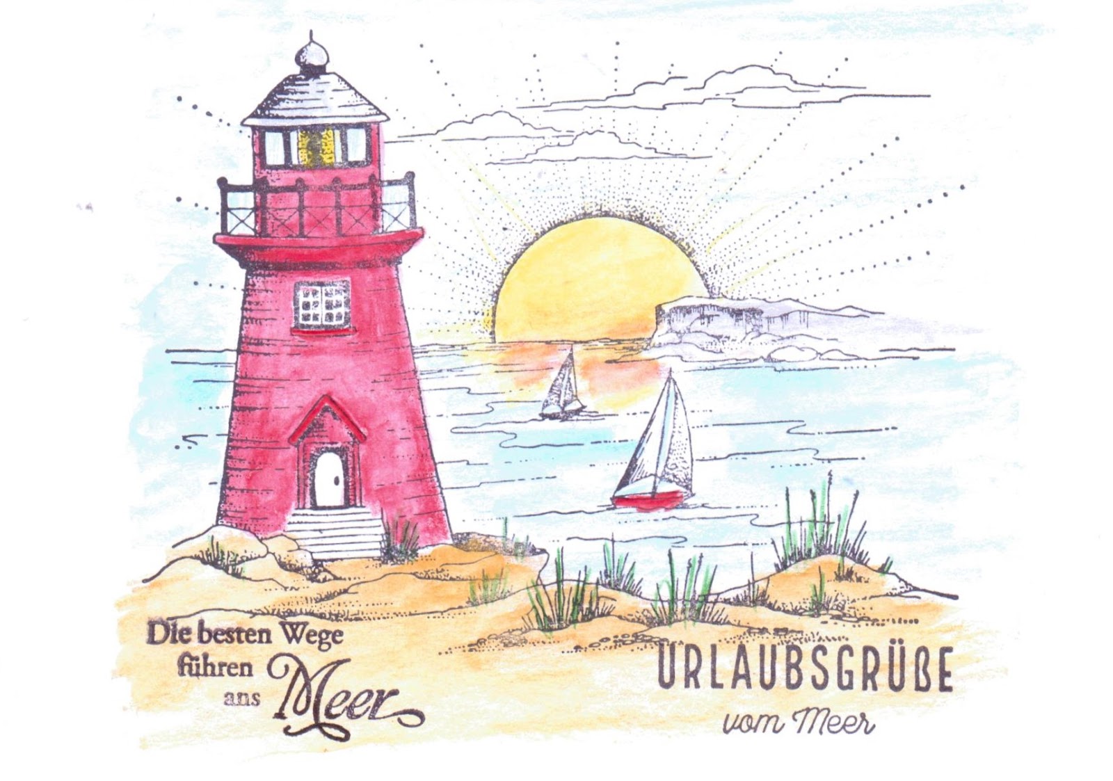 Postkarten Veröffentlicht am 3. September 2020 von ullasleseecke Ich besitze so viele maritime Stempel und hatte neulich die Idee, dass ich doch mal Urlaubspostkarten damit machen könnte. Gedacht – getan. Hier ist das Ergebnis meiner Fleißarbeit: Teilen mit: Auf X teilen (Wird in neuem Fenster geöffnet) X Auf Facebook teilen (Wird in neuem Fenster geöffnet) Facebook Gefällt mir Wird geladen … Ähnliche Beiträge