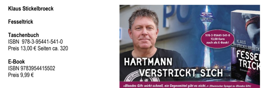 Klaus Stickelbroeck: Als alter Düsseldorfer hat Hartmann in den ersten Romanen in seinem vertrauten Wohnzimmer ermittelt. In seiner Heimatstadt kennt er sich aus, da kennt man ihn, da weiß er, was Sache ist. Ich lasse ihn jetzt in einer Szene ermitteln, die er sich neu erarbeiten muss. Ich fand es total spannend, ob und wie sich Hartmann auf unbekanntem Geläuf durch die turbulenten Situationen manövriert. Die BDSM-Szene kommt in sich geschlossen, leicht verrucht und verwegen daher. Ich war selbst gespannt, Hartmann bei seinen sehr temporeichen Ermittlungen am Limit zu beobachten.