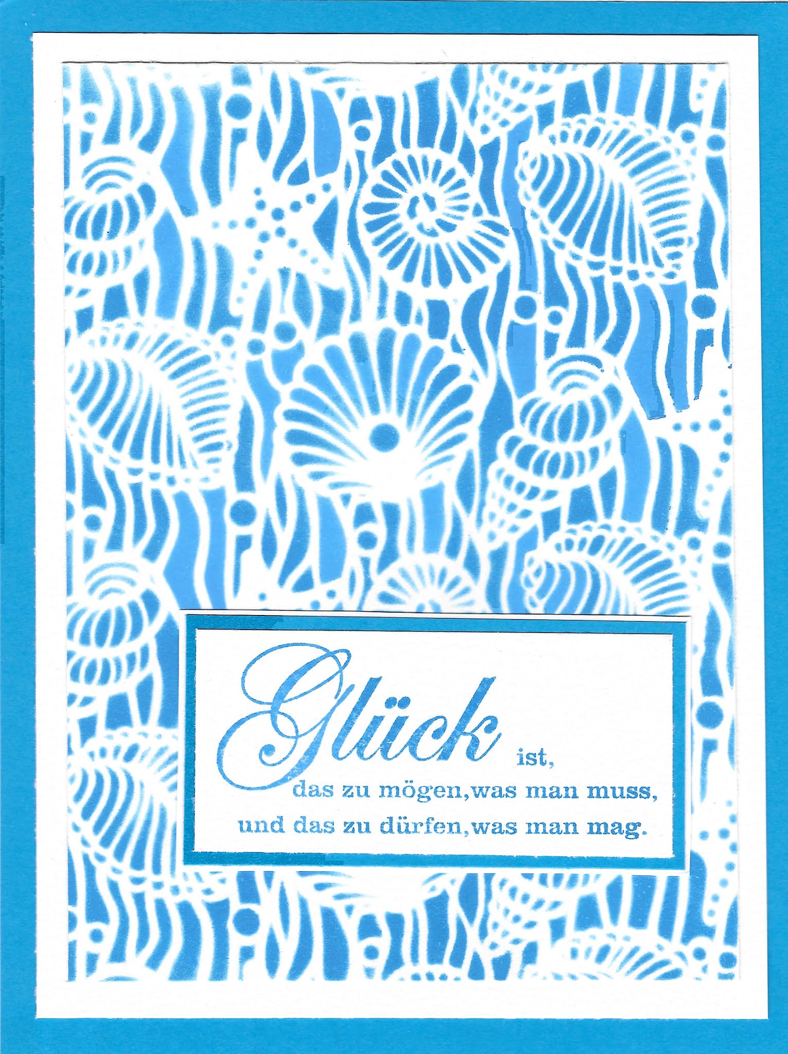Der Hintergrund wurde mit Hilfe einer Schablone und Stempelfarbe gewischt. Den Spruchstempel habe ich mir vor längerer Zeit mal zugelegt: