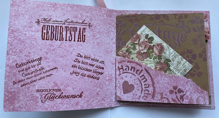 Das Innenleben solcher Karten kann jede individuell gestalten, mir gefällt dies am besten. Auf der großen Innenseite konnte ich verschiedene Stempel mit Sprüchen und Glückwünschen anbringen. Weiter ging es mit der Gestaltung der kleineren Seiten, das Papier für die Laschen habe ich gerissen und überall Motive mit Hilfe von Schablonen und Stempelfarbe gewischt.