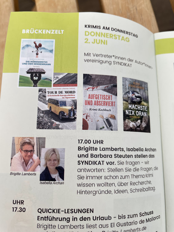Barbara Steuten hat ihre Kurzgeschichte aus dem Buch „Tour de Mord“ gelesen. Die mörderischen Schwestern, ebenfalls nicht gefährlich, haben zum Jubiläum dieser Vereinigung 25 kriminelle Kurzgeschichten aus dem Alpenraum veröffentlicht.
