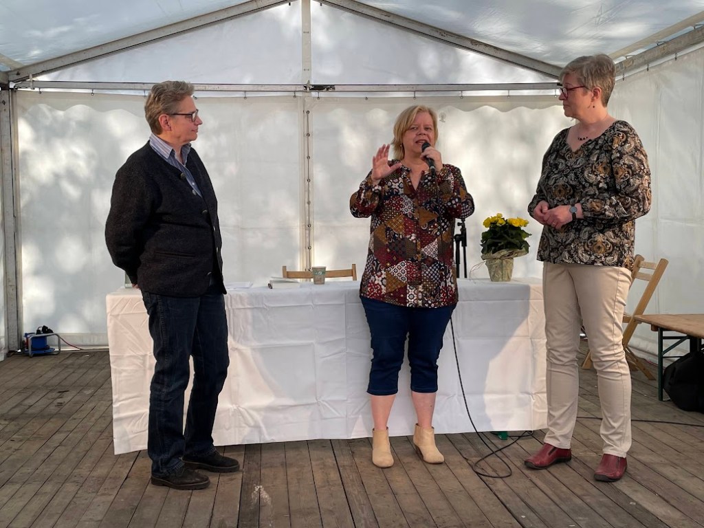 Allerdings war es in den letzten Jahren etwas anders, entweder musste der Bücherbummel ausfallen oder verschoben werden. In diesem Jahr durfte er wieder zur gewohnten Zeit stattfinden. Leider war es auch meine bevorzugte Urlaubszeit. Deshalb freute ich mich, dass ich kurz vor meinem Urlaub wenigstens zu einer Veranstaltung gehen konnte. Zu Hause waren die Koffer gepackt und ich konnte ganz entspannt im Lesezelt sitzen und den Autorinnen und dem Autor zuhören.