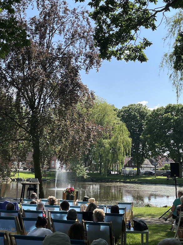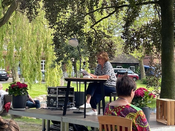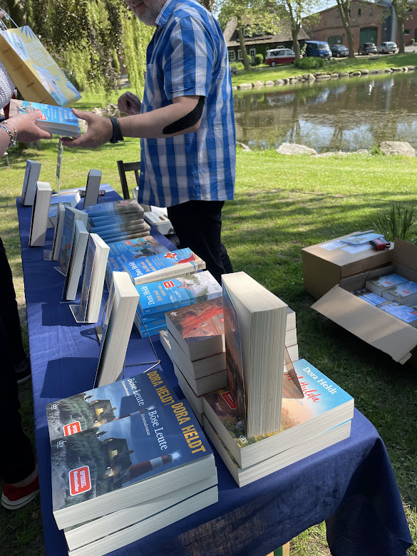 Seit Jahren mache ich auf der wunderschönen Insel Fehmarn Urlaub. Aber bisher hatte ich noch nie das Glück, dass ich während meines Urlaubs zu einer Lesung gehen konnte. Deshalb freute ich mich, als ich den Hinweis las, dass Dora Heldt am Dorfteich von Petersdorf aus ihrem neuen Buch lesen wollte.