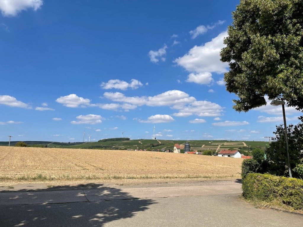 Ausblick vom Weingut auf den Ort Weinheim und umliegende Weinberge. Noch haben wir nicht unseren endgültigen Platz bekommen.