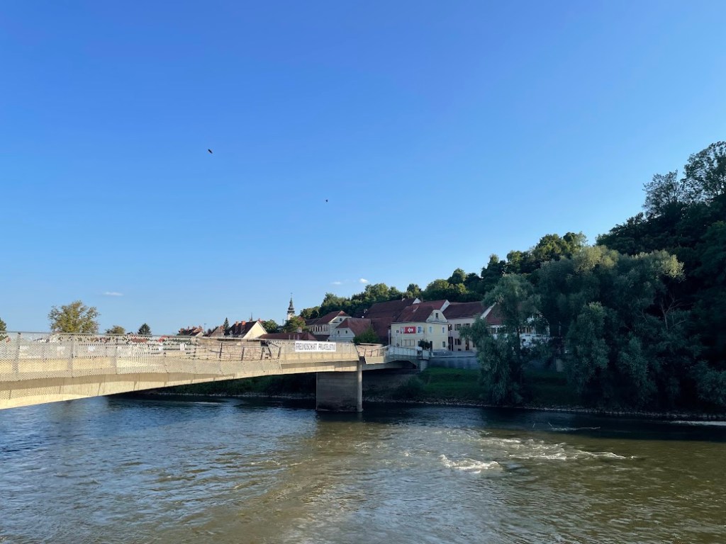 Hier ist die Mur der Grenzfluss. Auf der anderen Seite befindet sich in Slowenien das Schloss Oberradkersburg.