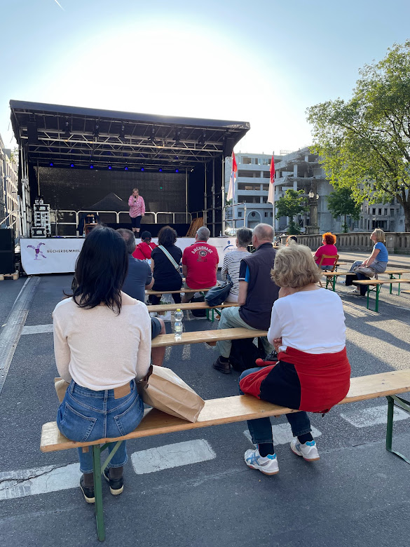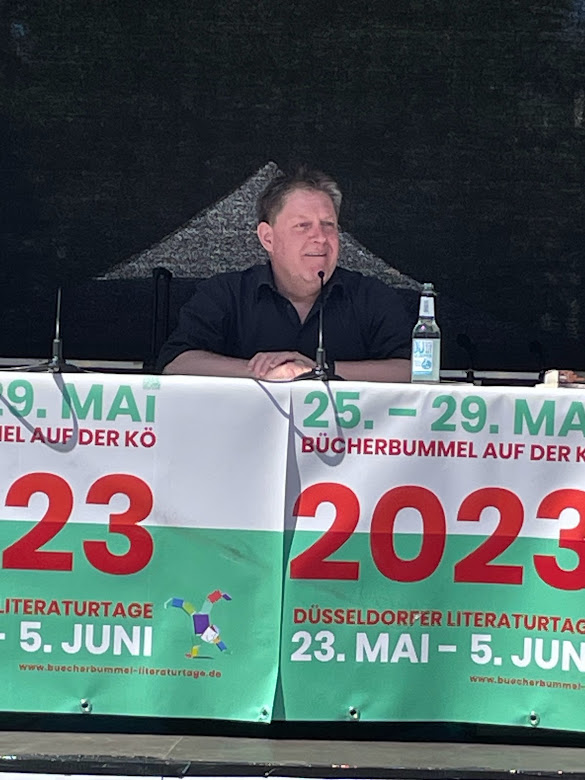 Der Vormittag war sehr kurzweilig. Ich hatte einen angenehmen Schattenplatz erobert, denn in diesem Jahr war es ein richtig gutes Kaiserwetter, allerdings war es sehr sonnig und dementsprechend warm auf den Sitzbänken. Ich hatte leider meinen Sonnenschutz vergessen, aber, wie erwähnt, hatte ich einen schönen Schattenplatz und konnte mich an dem Anblick des Kö-Grabens erfreuen, während ich mit einem Ohr der nächsten Autorin lauschte.