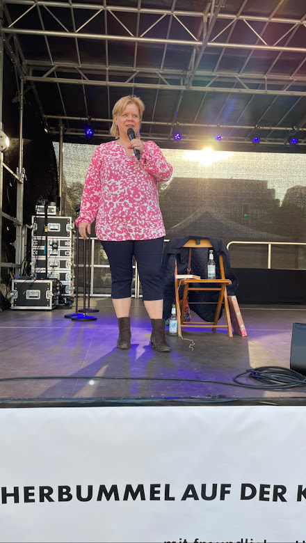 Um 11 Uhr wollte ich mir die Autorin Inka Stein anhören, es sollte aus dem Buch „Die Kirschen in des Mörders Garten“ gelesen werden. Einem Schrebergartenkrimi, dessen Handlung in Düsseldorf am Rhein spielte. Allerdings war es nicht nur eine Autorin, sondern ChristINa Seitz und KAty Albrecht, die unter dem Pseudonym das Buch geschrieben haben.