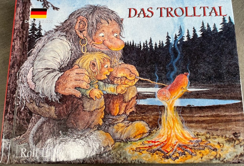 In Lillehammer gibt es das wunderschöne Freilichtmuseum Maihaugen und natürlich gehört auch ein Shop dazu, in dem Souvenirs erworben werden können. Verführerisch war das nicht für mich, aber dann entdeckte ich den Tisch mit den Büchern. Begeistert war ich, als ich ein Bilderbuch mit einem deutschen Buchtitel entdeckte. Was meint Ihr wohl, so ein wunderschönes Büchlein kann ich dann doch nicht liegen lassen. Die Bilder sind so liebevoll gestaltet. Der Künstler Rolf Lidberg hat mich dann auf der ersten Seite eingeladen, die Trolle ein Jahr lang zu begleiten. Das zweite Bild zeigt den Trollvater mit dem Trollmädchen Syren auf einer sommerlichen Blumenwiese.