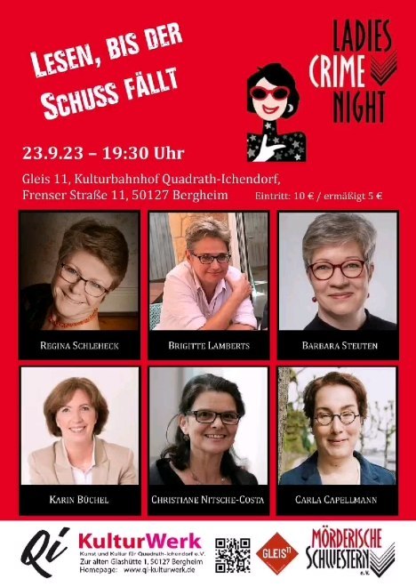 Ich freute mich, dass ich endlich mal zu einer LCN, einer Ladies Crime Night konnte, die in meiner näheren Umgebung stattfand. Naja, nähere Umgebung ist etwas übertrieben, es war dann doch ungefähr eine Stunde Fahrt bis dahin. Im Kulturbahnhof von Quadrat-Ichendorf sollten sechs Autorinnen, allesamt Mörderische Schwestern lesen, bis der Schuss fällt. Sie hatten jeweils acht Minuten Zeit und natürlich war die Zeit oft an einer Stelle zu Ende, wo es sehr spannend wurde. Dass dann viele darauf neugierig waren, wie es weitergeht, versteht sich von selbst.