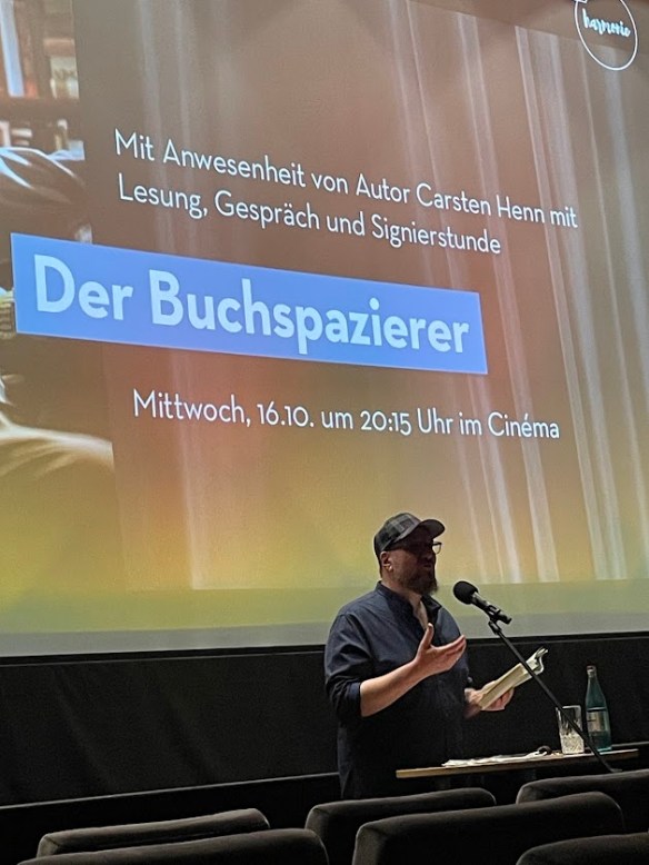 Der Buchspazierer eine Buchverfilmung – der Autor Carsten Henn war anwesend und hat nicht nur etwas aus seinem Buch gelesen, sondern uns auch Hintergrundinformationen gegeben. Beispielsweise wie er auf die Idee gekommen ist und weshalb er das Buch geschrieben hat. Natürlich gab es auch einige Infos zur Verfilmung, was ich sehr interessant fand. Danach durften wir uns den Film ansehen, von dem ich angenehm überrascht war. Denn leider musste ich in den vergangenen Jahren öfter die Erfahrung machen, dass der Film nicht das versprach, was ich mir beim Lesen des Buches gewünscht und erhofft hatte. Diesmal passte alles hervorragend. Die Besetzung der Figuren ist bestens gelungen, denn Christoph Maria Herbst und Yuna Bennett waren für mich wirklich der Buchspazierer und seine Begleiterin Schascha.. Mehr dazu werde ich ebenfalls in einem separaten Beitrag berichten.