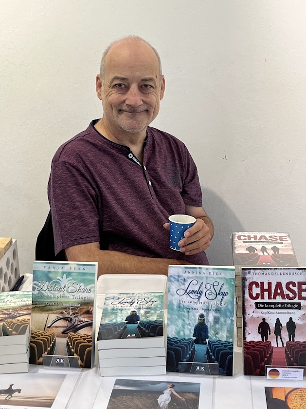 Thomas Dellenbusch ist ebenfalls sehr vielseitig tätig. Hier möchte ich erwähnen, dass er als Autor die spannende Serie „Chase“ geschrieben hat. Die komplette Trilogie hat er in einem Kopfkino-Sammelband angeboten. Aber natürlich hat er noch weitere Bücher geschrieben und mitgebracht. In seinem eigenen KopfKino-Verlag bringt er außerdem eine Anzahl Bücher verschiedener Autoren heraus, die den interessierten Besuchern angeboten wurden.