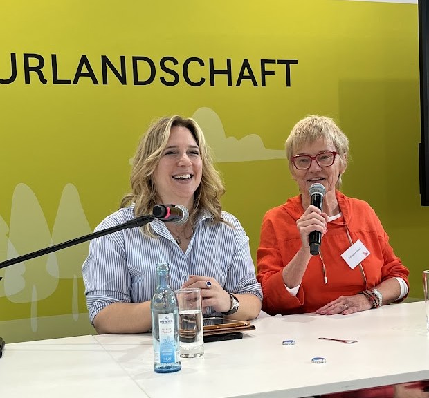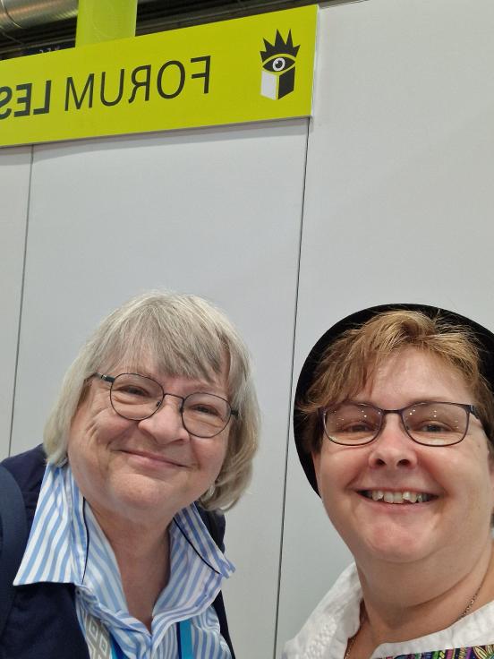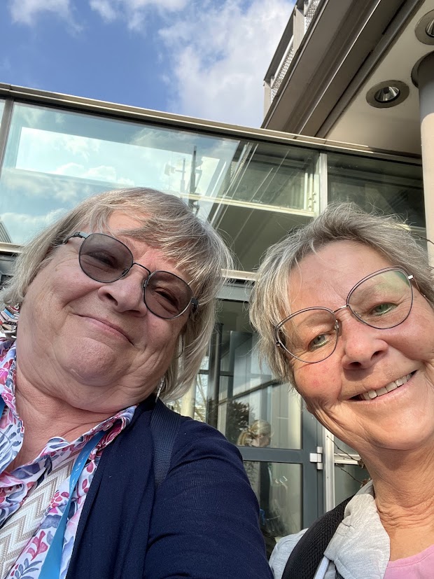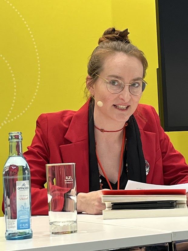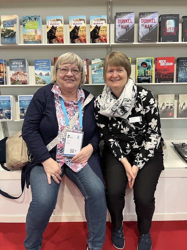 Bereits während und kurz nach der Fahrt habe ich zwei Autorinnen getroffen. Stina Jensen entdeckte ich kurz nach dem Umsteigen in Frankfurt und wir begrüßten uns erfreut. Auf der Messe sollte ich sie noch öfter antreffen und davon gibt es auch ein Bild, das ich noch zeige.