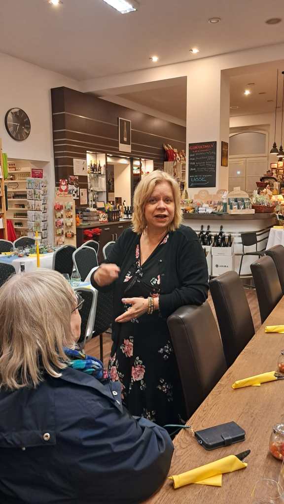 Das war ein gelungener Abschluss des zweiten Tages in Leipzig, wir wurden mit Wein und Essen verwöhnt und von der Autorin bestens unterhalten.