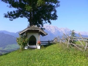 Die erste Wanderung. Am Wegrand das Häuschen, im Hintergrund der Hochkönig.