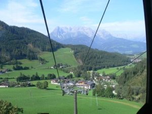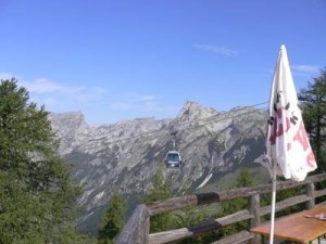 Ich lösche meinen Durst im Gasthaus, die Gondel schwebt \“vor\“ den Eiskögeln