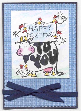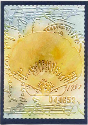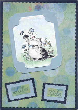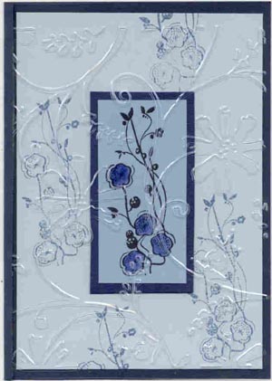 Hier habe ich mit einer Cuttlebug Schablonen das Motiv geprägt und mit Distress gewischt. Weil das Motiv für sich selbst schon gut wirkt, habe ich die Karte einfach auf blaues Papier geklebt:
