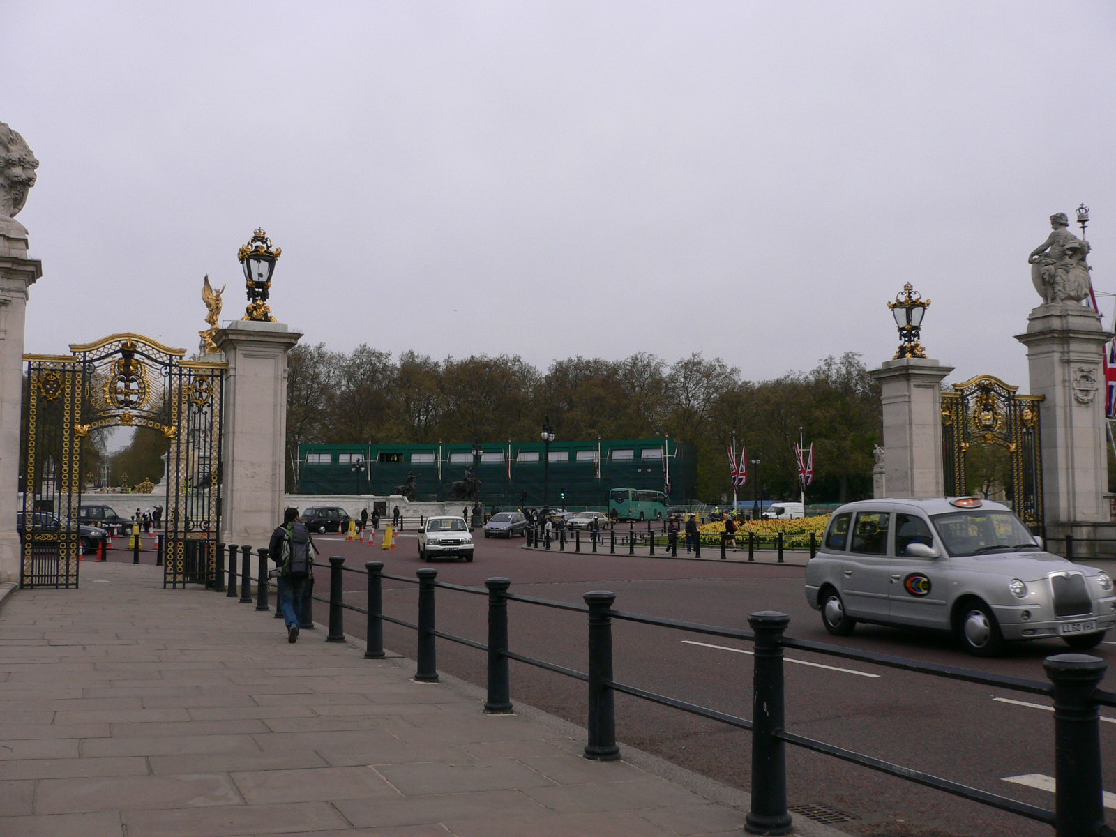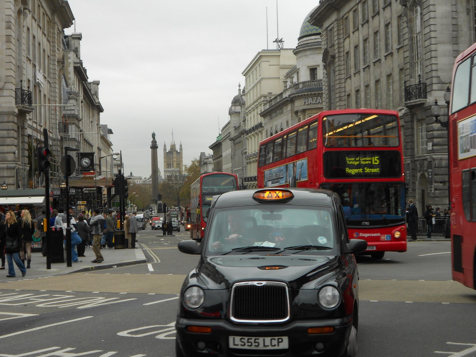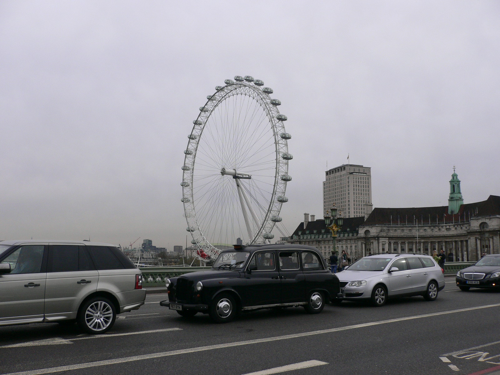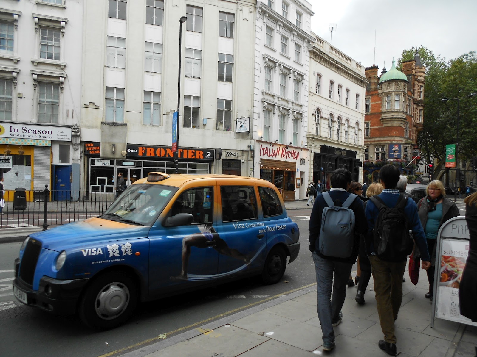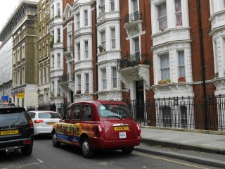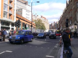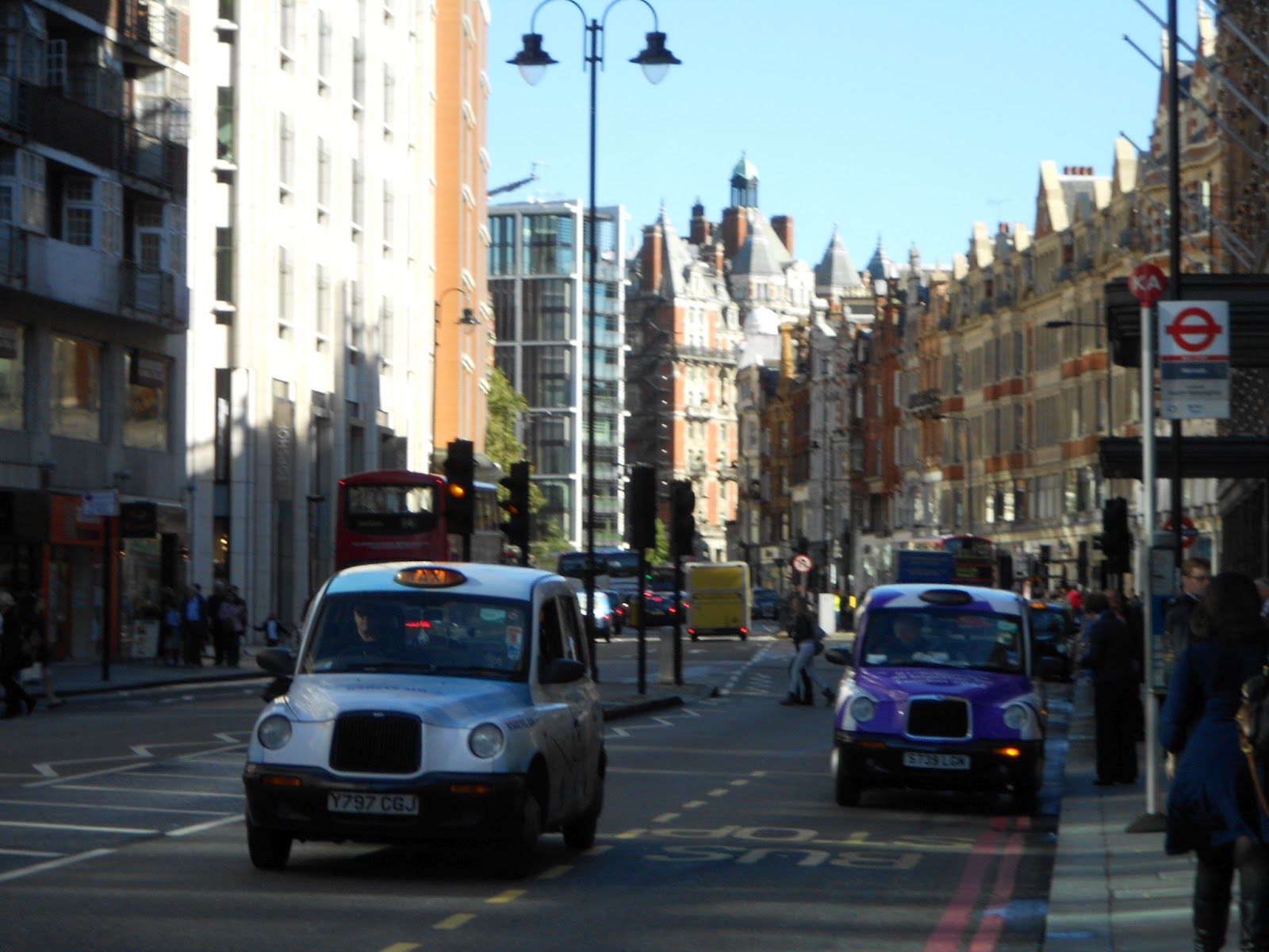 warten vor Harrods, die Taxen sind nun bunter geworden und tragen zum farblichen Straßenbild bei.