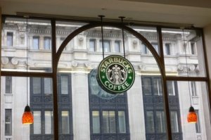 Starbucks in der Regent Street, Ausblick auf das schöne Haus gegenüber