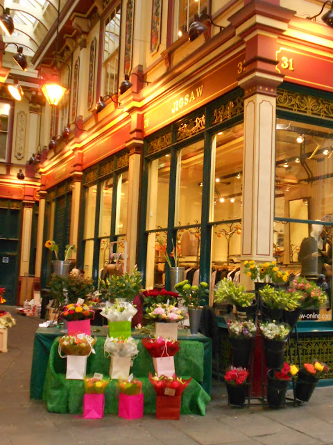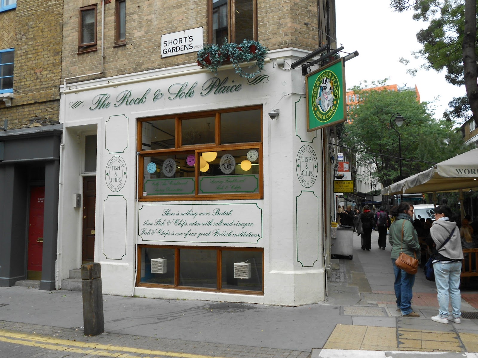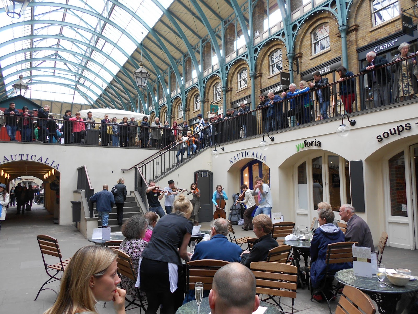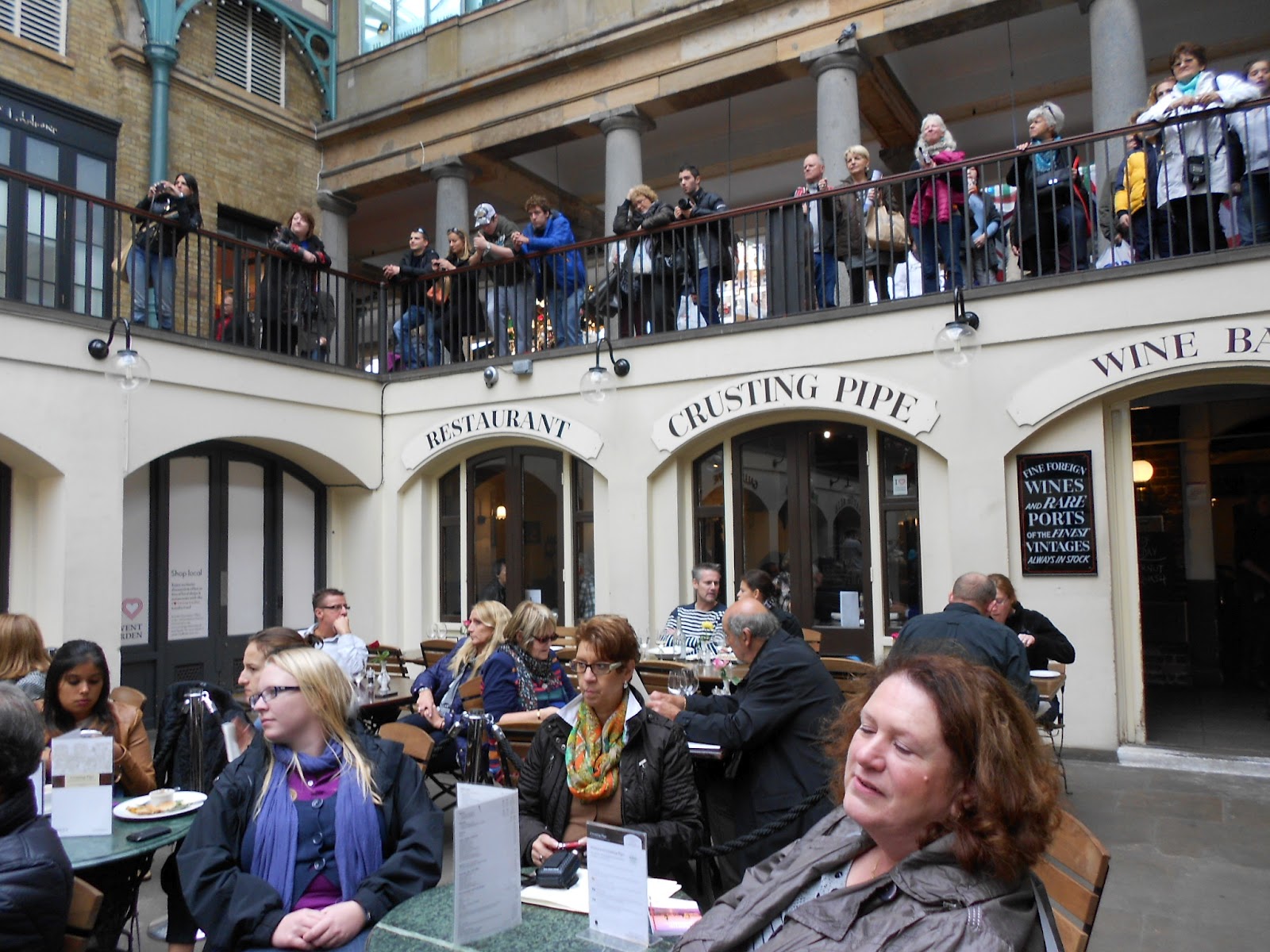 Nun meldete sich aber auch unser Magen, ergab Zeichen, dass er mal etwas anderes als Kaffee haben wollte. Nach Londoner Zeit war es ja auch schon 14.30 Uhr und ein Mittagessen längst fällig. Und was wählt man dann zu Mittag? Ja, klar Fish and Chips. Voriges Jahr hatten wir in Covent Garen ein nettes Lokal gefunden, wo es uns geschmeckt hat und dort wollten wir wieder hin. Falls es voll sein sollte, dann hätten wir dort mit Sicherheit auch noch etwas gefunden. Aber wieder haben wir vergessen, dass die Touristenströme nicht unterwegs sind und die Londoner ihrem Alltag nachgehen. Es war fast leer und so konnten wir in einer stressfreien Umgebung unser Essen einnehmen. Mir schmeckt es, das gebe ich zu. Allerdings hätte ich gerne hinterher einen Degistif zu mir genommen, aber das scheinen sie dort nicht zu kennen. Wir haben danach nämlich noch in einem Pub gefragt, ob wir dort ein Getränk dieser Art bekommen können, aber das war ein Satz mit x. Nun waren wir pattsatt und kaputt. Die eine oder andere klagte über Füße, Zeh oder sonst was. So verabredeten wir, dass wir uns jetzt nur noch in den Hallen umsehen und die Atmosphäre auf uns wirken lassen. Nette kleine Geschäfte konnten wir aufsuchen, um unsere letzten Pfund und Pennys loszuwerden. Leider wurde das Wetter nun etwas ungemütlich. Den ganzen Tag hatten wir Glück, außer ein paar Regentropfen, für die es sich kaum lohnte den Schirm zu öffnen, war es trocken, aber auch kalt und windig. Gerne hätte ich mich noch etwas auf eine Bank gesetzt und einfach nur geguckt, aber nun regnete es doch etwas mehr und dann macht das ja auch keinen Spaß. Auf der anderen Seite hatten wir ja noch den Weg zum Flughafen vor uns und zu knapp wollten wir auch nicht fahren.